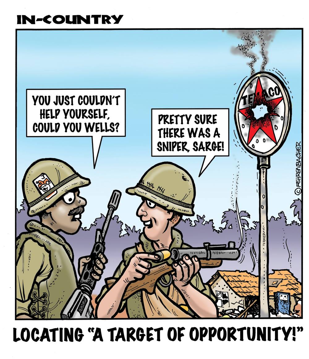 Phil enlisted in the Army in 1965 where he served for years in Vietnam. He became a graphic designer and has worked for the state of Oregon for 26 years. He retired in 2003 and started the Cartoon "In-Country". The cartoons reflect his experiences during his tour of duty in South Vietnam.