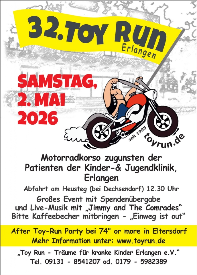 The 'Erlangen Toy Run' is a fixed feature in the event calendar for bikers, Erlangen citizens, patients, and their relatives – it has become an institution. Initially, 50 motorcycles would ride to the children's clinic in Erlangen, but today over 1,200 machines take part in the annual procession – from Heusteg to Dechsendorfer Weiher, via Möhrendorf to Maximiliansplatz – lined by hundreds of spectators along the route and more than 1,000 expectant people at and in the children's clinic.